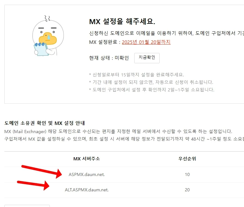MX 레코드 변경 후 적용되는 데 몇 시간 걸릴 수 있습니다.